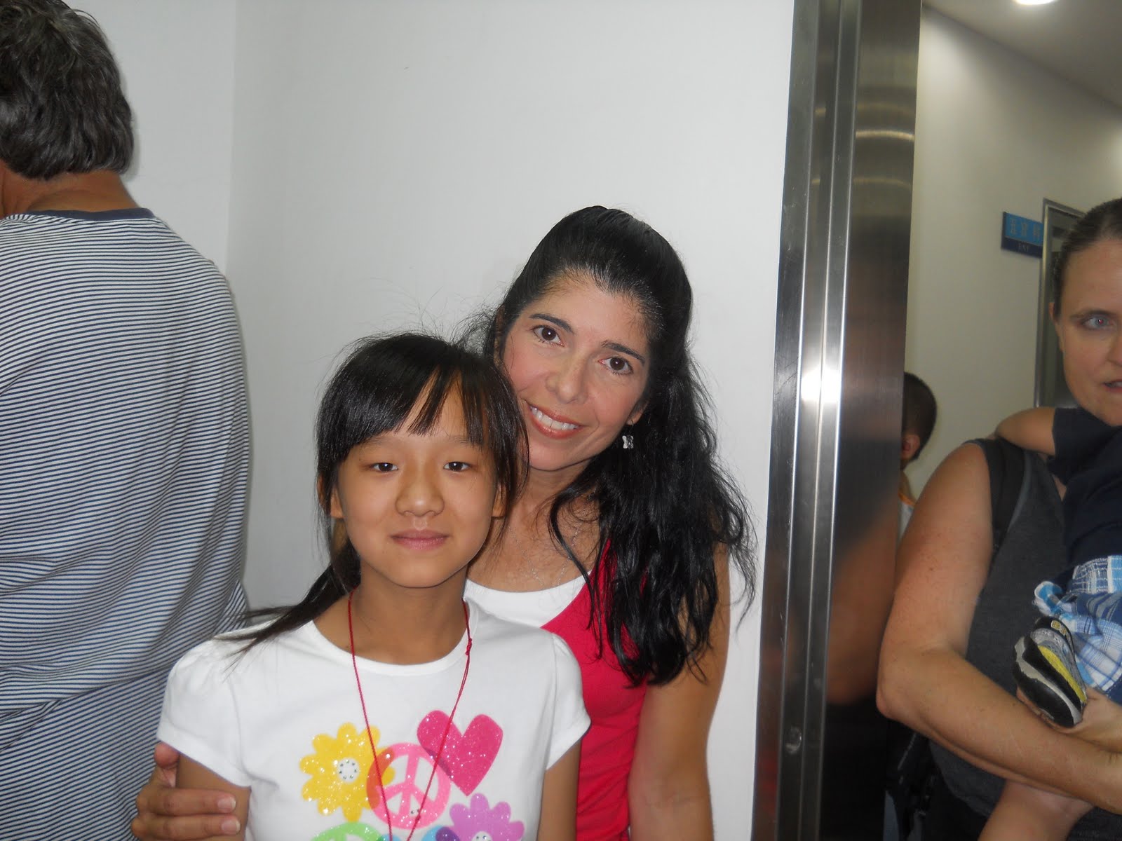 Arrived yesterday and this morning after breakfast, we met the other family from our agency that also adopted a 12 year old (from a different province) in fact, their daughter is exactly 1 week older than Bellamei. The 3 girls are having a lot of fun together. The first thing we did was go to have the medical exam done. I was very relieved that our guide was able to receive an immunization record from Bellamei's orphanage, via email. We weren't sure we would be able to get it, and if not, that would've meant many shots for her at the medical exam today. Turns out, since we were able to obtain a shot record from the orphanage, she only received 4 regular shots, 1 oral shot, and the TB test. She is about 10 lbs lighter than Briella, and about 3.5 inches shorter. She did just fine with the shots, what a sweetie she is. Then we walked around the island and shopped together with the other family. Bellamei is a good shopper and doesn't ask for much.. she is very poised. I got some nice gifts and I also got 2 traditional silk dresses for her. She danced and sang in one of the shops we were in (I asked her if she would) and I am just so impressed with her grace, and her voice is delicate and beautiful. We will go back to the medical clinic on Monday to have her TB result looked at and do a little more shopping there, which is so fun (and pick up some laundry we dropped off). We had a yummy lunch at Lucy's and Bellamei loves broccoli, just like Briella and me.